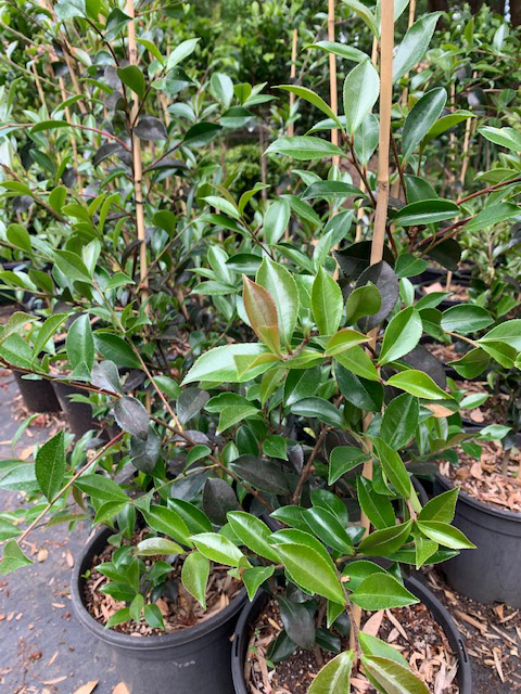 Camellia sasanqua 250 mm pots $35 each, Evergreen shrub glossy dark green leaves white flowers.